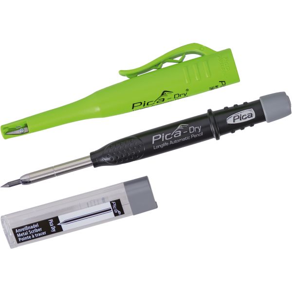 The Pica Dry metal set with carbide scriber is ideal for everyday work with metal. Because the metal scriber is so robust, it enables precise marking for a very long time,