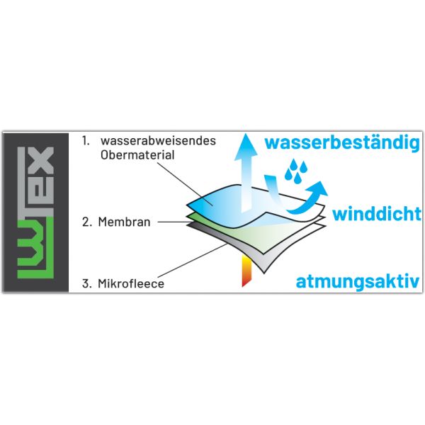 Obermaterial: 100 % Polyester (Twill) + TPU (Membran) + 100 % Polyester (Mikrofleece), 300 g/m²