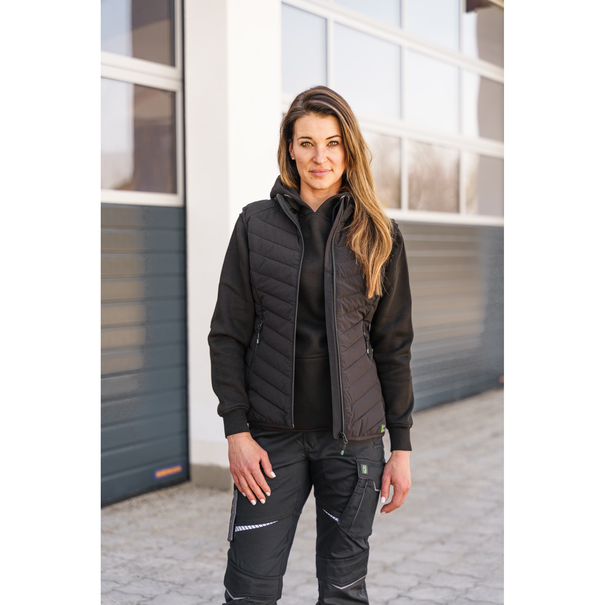 Aufhänger innen, Frontreißverschluss mit Untertritt und Kinnschutz, westensaum und Armlöcher mit elastischem Einfaßband.