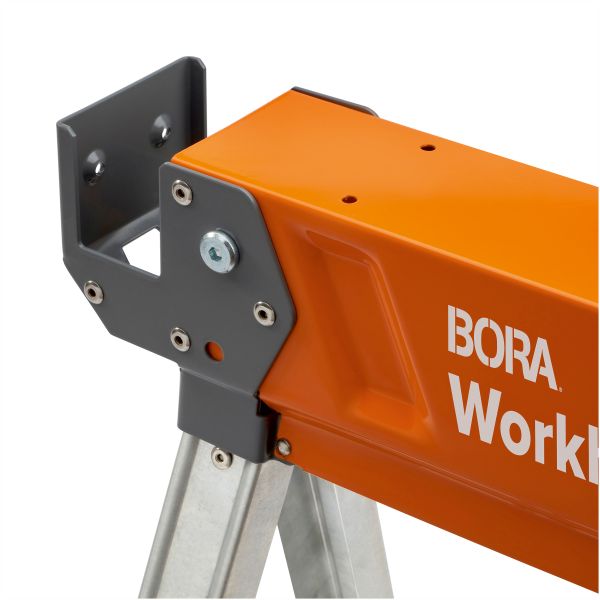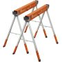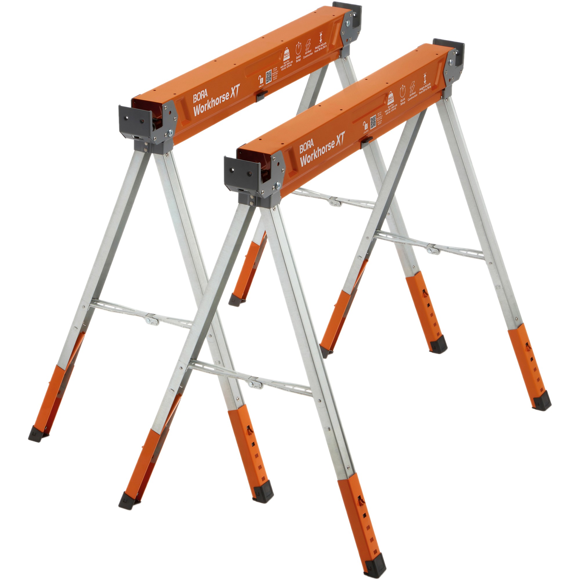Robuste Arbeitsböcke aus Stahl mit einer Einzeltraglast von 612 kg einzeln oder 1224 kg im Paar. Verstellbare Füße zur Justierung der Arbeitshöhe von 76,2 cm bis 86,3 cm. Seitliche Aufnahmen (38 x 89 mm) mit Bohrungen zum Einsetzen und Befestigen von Kanthölzern zur Schaffung einer robusten Arbeitsfläche. An der Unterseite befindet sich ein eingebauter Flaschenöffner. Lieferung erfolgt im Set, bestehend aus zwei Arbeitsböcken.