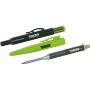 2,8 mm Tieflochmarker in hochwertiger Aluminiumkonstruktion, die den Anforderungen der Baustelle standhält. Kann bis zu 100 mm tief in einem 3 mm breiten Loch und 145 mm tief in einem 6 mm breiten Loch markieren. Speziell designter Haltegriff für bessere Kontrolle bei der Arbeit. Ausgestattet mit einer Anti-Roll-Funktion. Inklusive Magazin mit 6 Ersatzminen Graphit 2B, 2,8 x 120 mm.