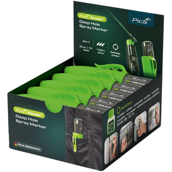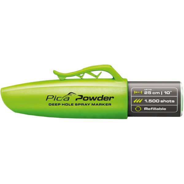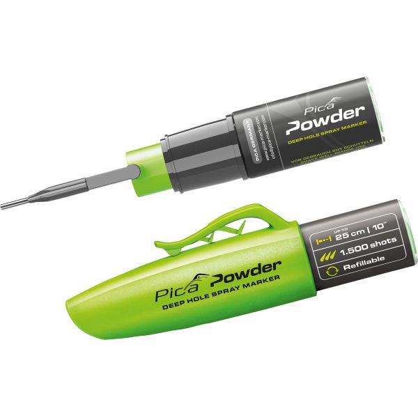 Für kontaktloses und präzises Markieren durch Bohrlöcher bis 25 cm Tiefe. Grün-fluoreszierendes Pulver auf Kreidebasis, welches einfach nachgefüllt werden kann. Haftet auf allen Oberflächen und ist leicht entfernbar.
