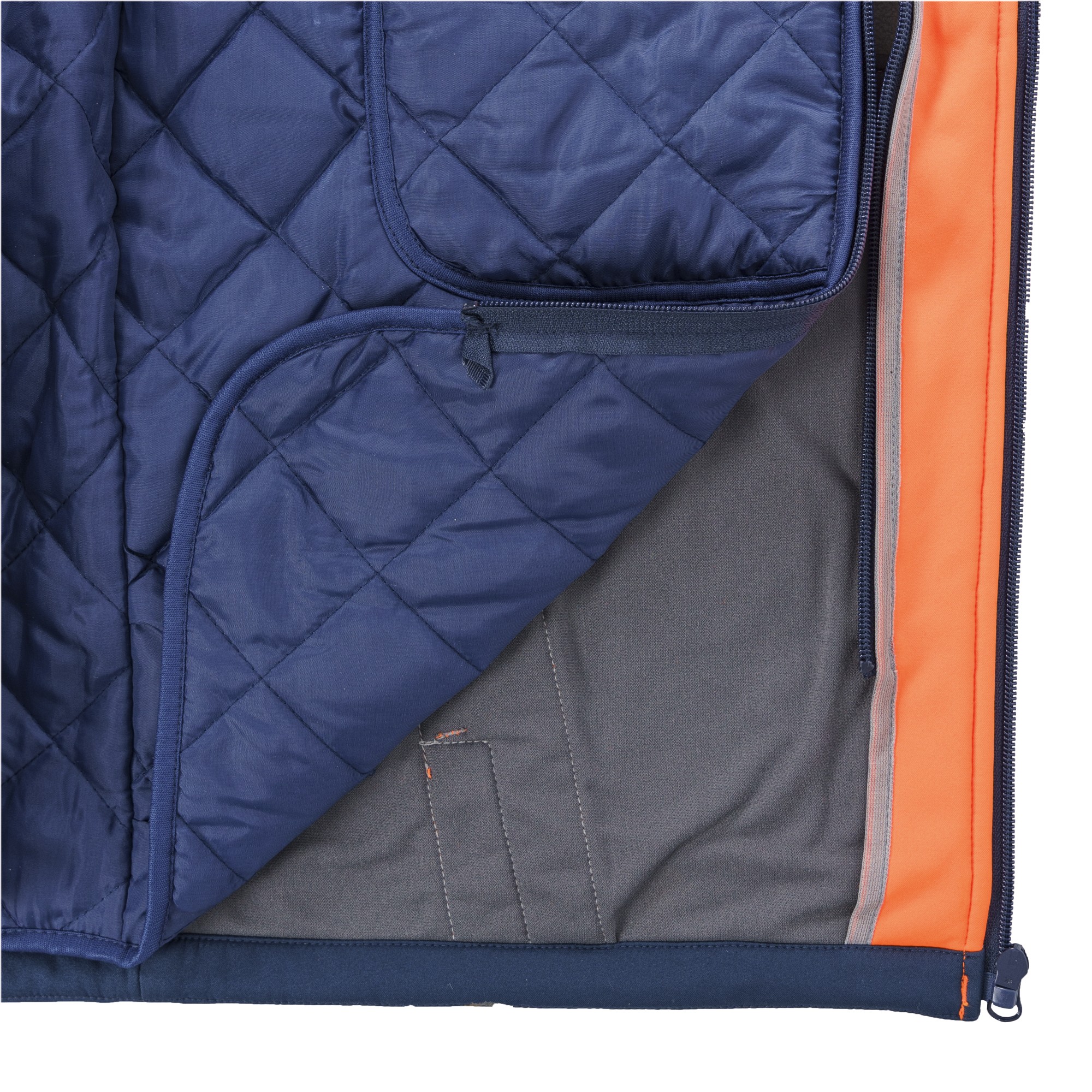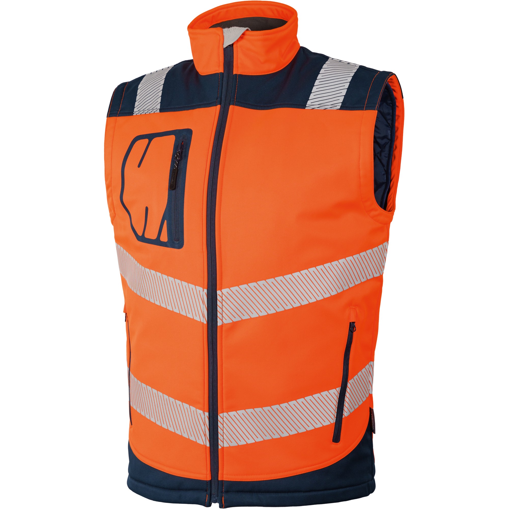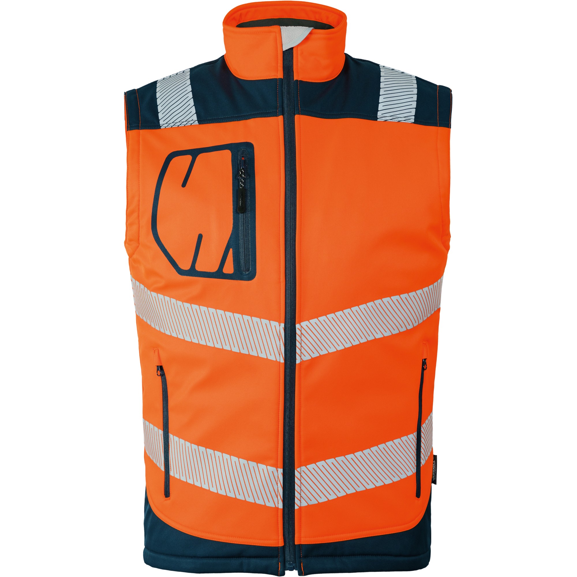 robustes 3-Lagenlaminat-Softshell Twill/ TPU-Membran/ Mikrofleece, herausnehmbares Steppfutter mit effektivem Kälteschutz, 2 x 5 cm breite, segmentierte Reflektorstreifen umlaufend am Rumpf und je 1 x 5 cm an den Schultern, Frontreißverschluss mit Untertritt und Kinnschutz, verlängertes Rückenteil, Kontrasteinsätze in marineblau
