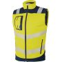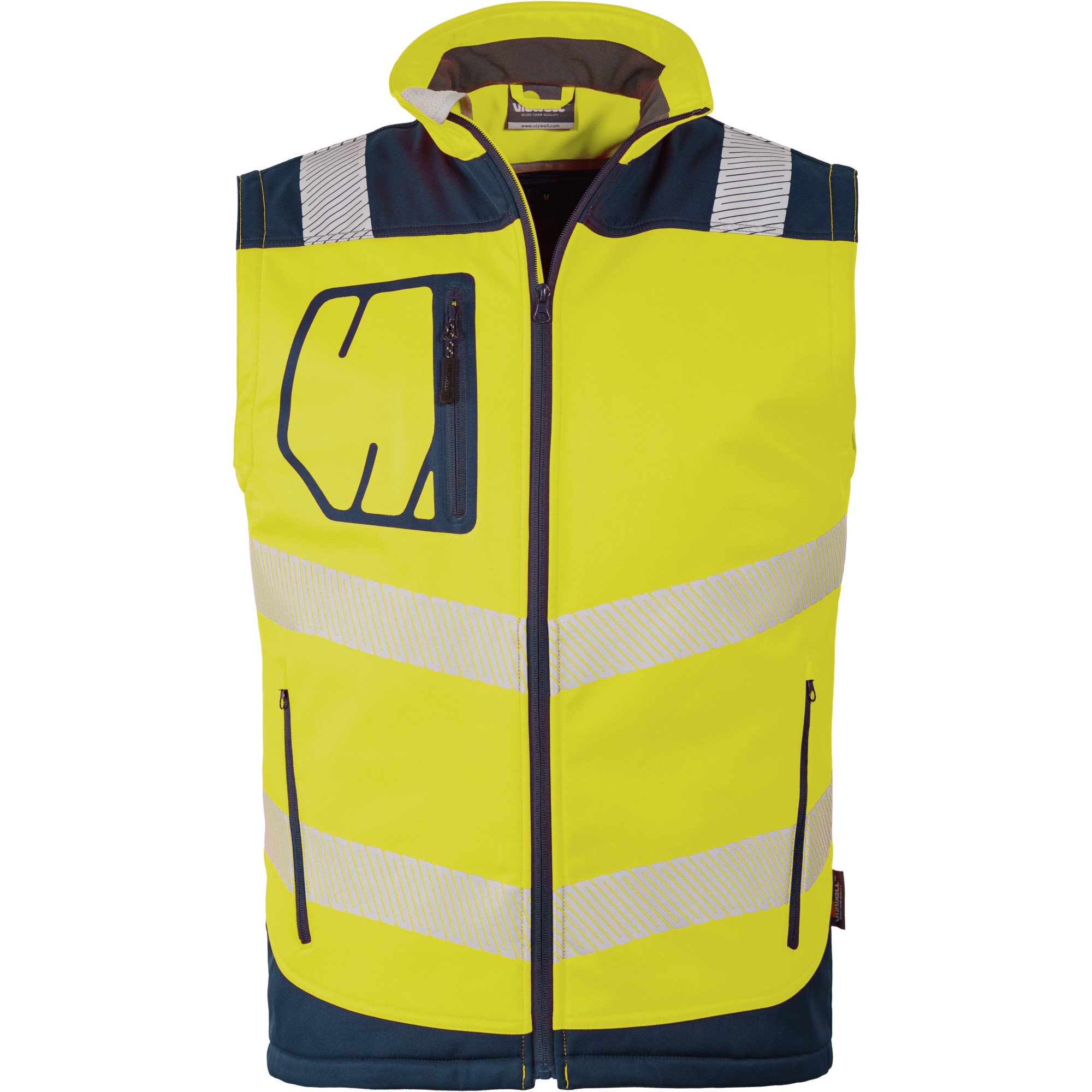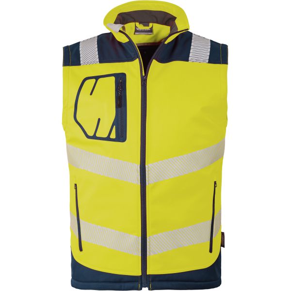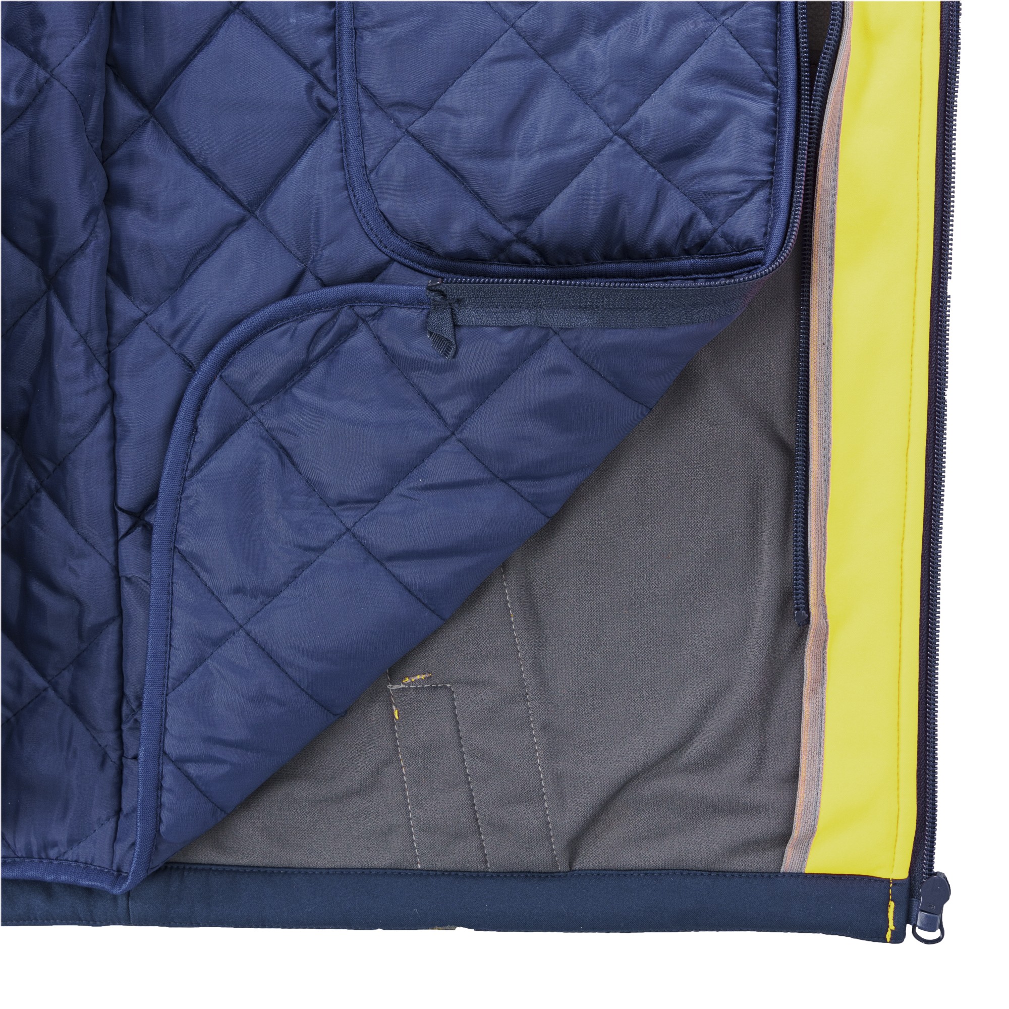 robustes 3-Lagenlaminat-Softshell Twill/ TPU-Membran/ Mikrofleece, herausnehmbares Steppfutter mit effektivem Kälteschutz, 2 x 5 cm breite, segmentierte Reflektorstreifen umlaufend am Rumpf und je 1 x 5 cm an den Schultern, Frontreißverschluss mit Untertritt und Kinnschutz, verlängertes Rückenteil, Kontrasteinsätze in marineblau