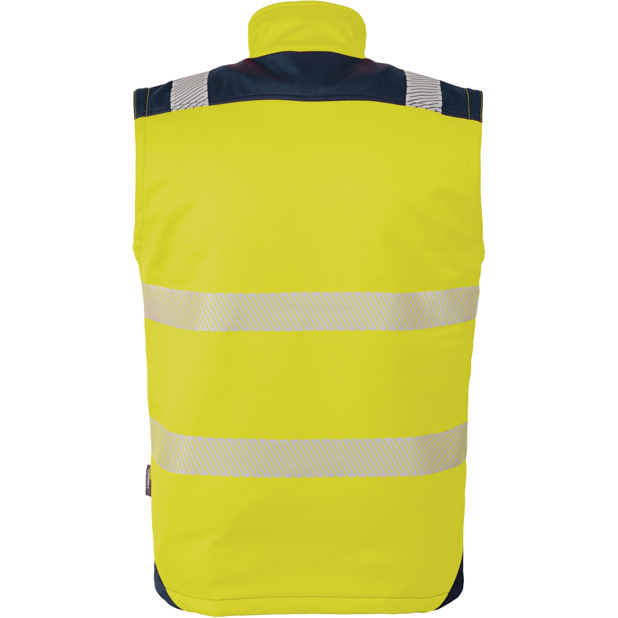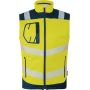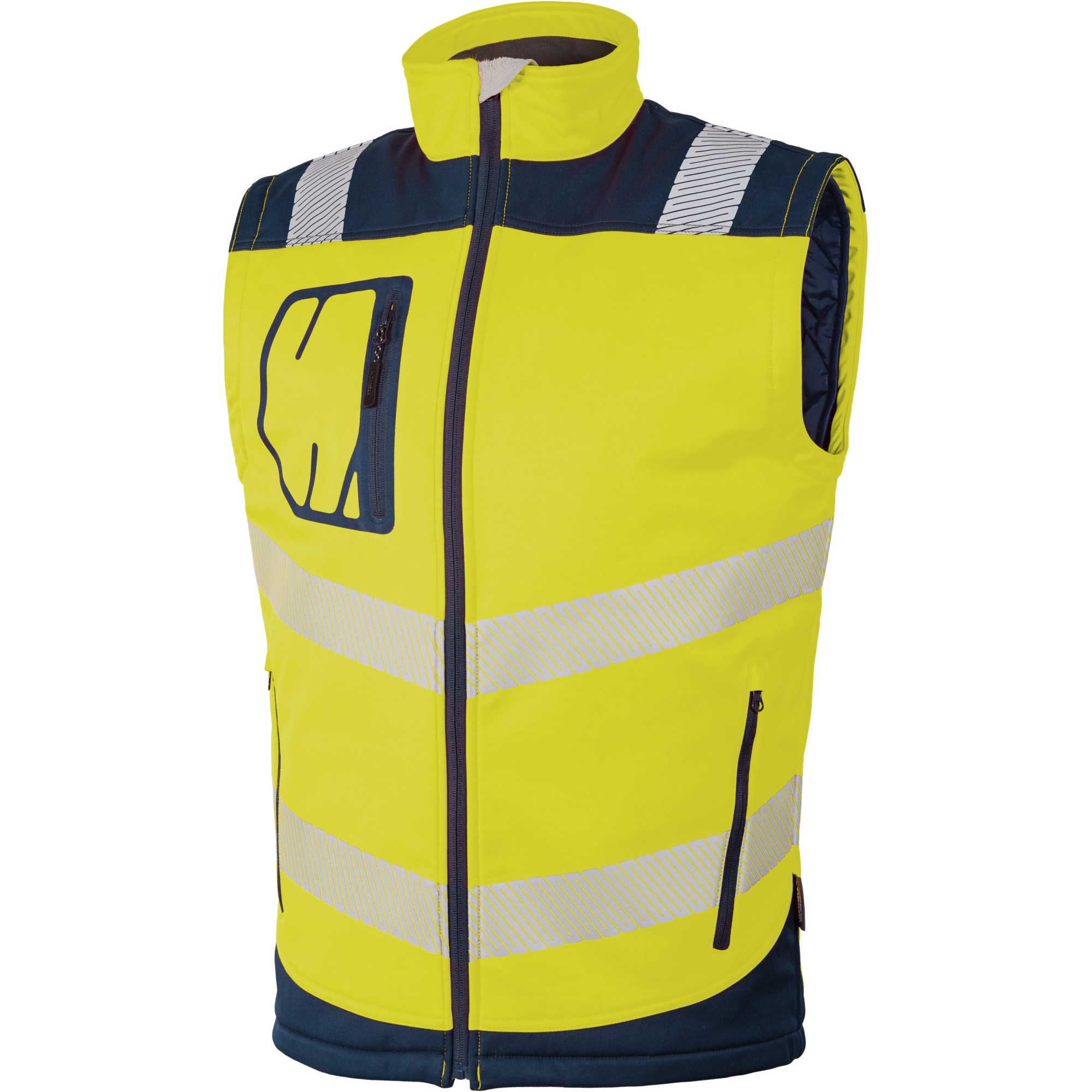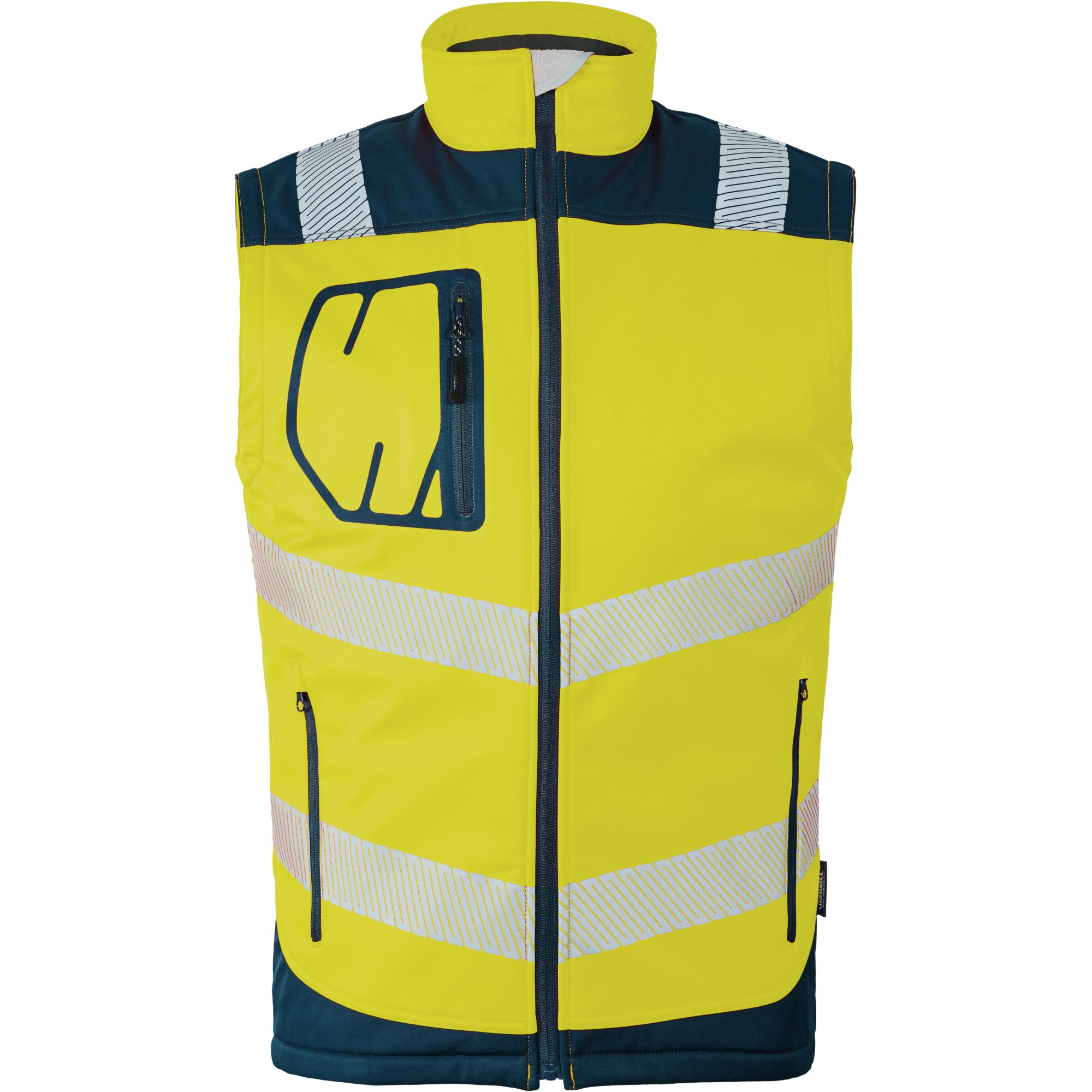 robustes 3-Lagenlaminat-Softshell Twill/ TPU-Membran/ Mikrofleece, herausnehmbares Steppfutter mit effektivem Kälteschutz, 2 x 5 cm breite, segmentierte Reflektorstreifen umlaufend am Rumpf und je 1 x 5 cm an den Schultern, Frontreißverschluss mit Untertritt und Kinnschutz, verlängertes Rückenteil, Kontrasteinsätze in marineblau